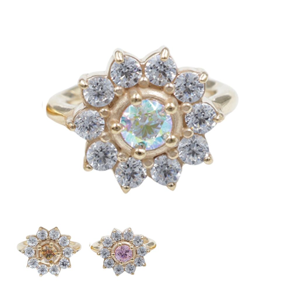 センターに配した一石が繊細な輝きを放ち、周囲を取り囲むストーンがエレガントな存在感を演出します。